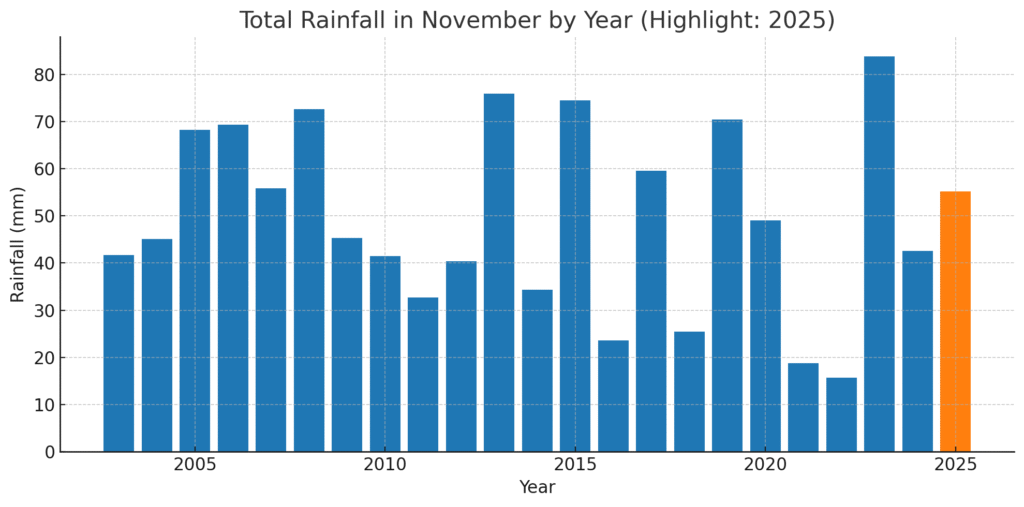 It shows that November 2025’s rainfall was moderately above the historical average, placing it among the wetter but not extreme Novembers in the dataset.